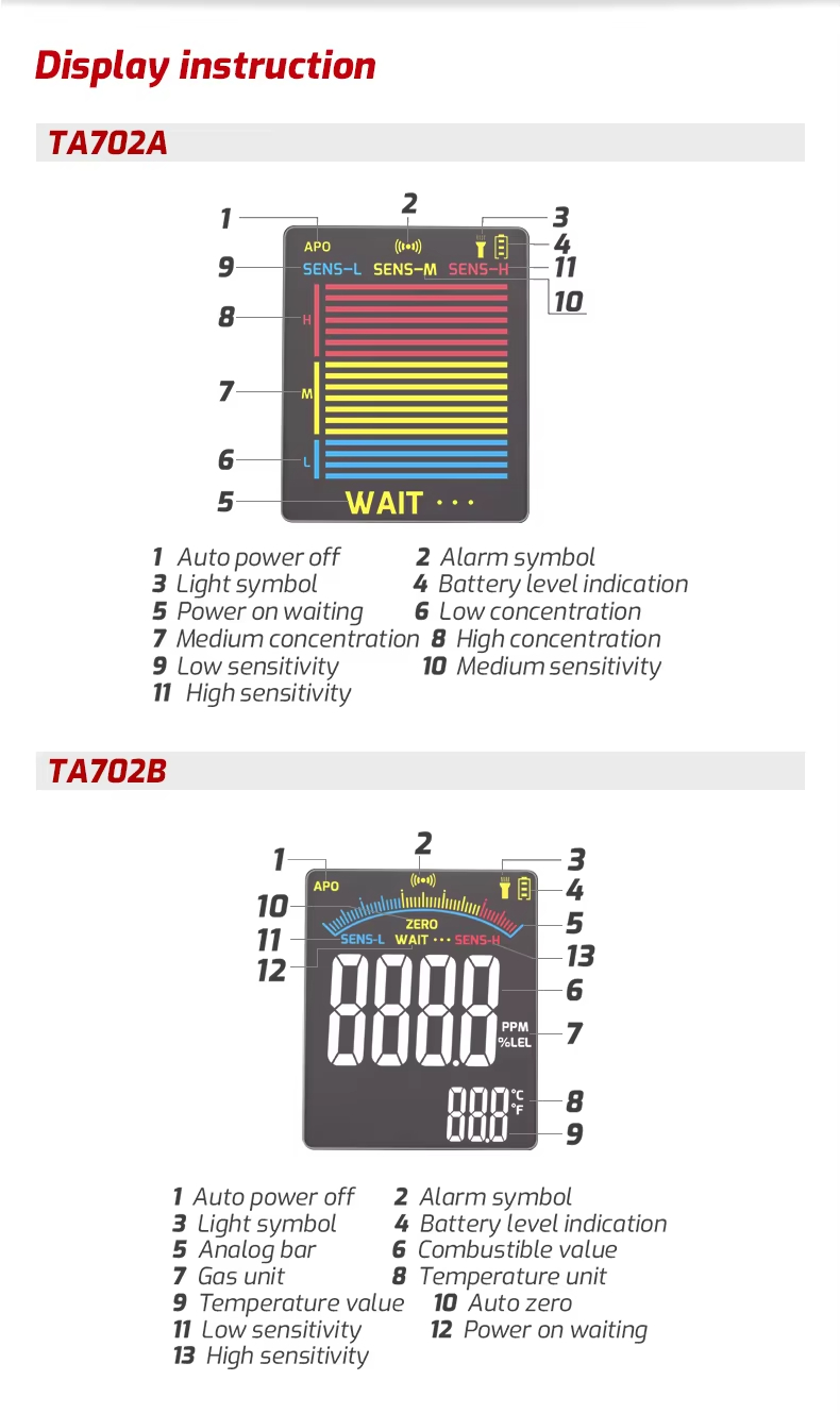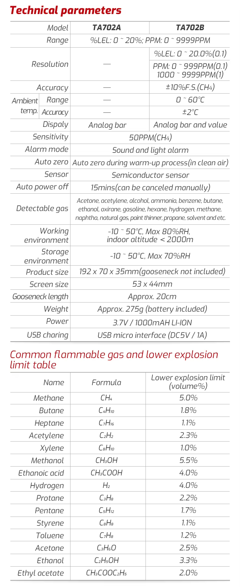 2.Robust Detection Performance: The TA702B is designed for reliable detection of flammable gases, ensuring prompt alerts and accurate readings. It is capable of detecting even low concentrations in potentially explosive atmospheres, providing users with a high level of safety and peace of mind.